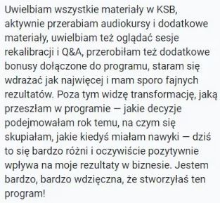 Już wiesz, że MOŻESZ dotrzeć do dziesiątek, a nawet setek klientów. Dlatego oswajasz widoczność i sprzedaż, aby czuć się z tym całkowicie naturalnie. Dostajesz coraz lepsze pomysły... i co za tym idzie, masz odwagę do coraz większych zmian. A za zmianami idzie finansowa i życiowa rewolucja. Pierwsi klienci, stabilne 10 tys. miesięcznie, 20, 50, 100 tysięcy miesięcznie - to staje się Twoją normą.